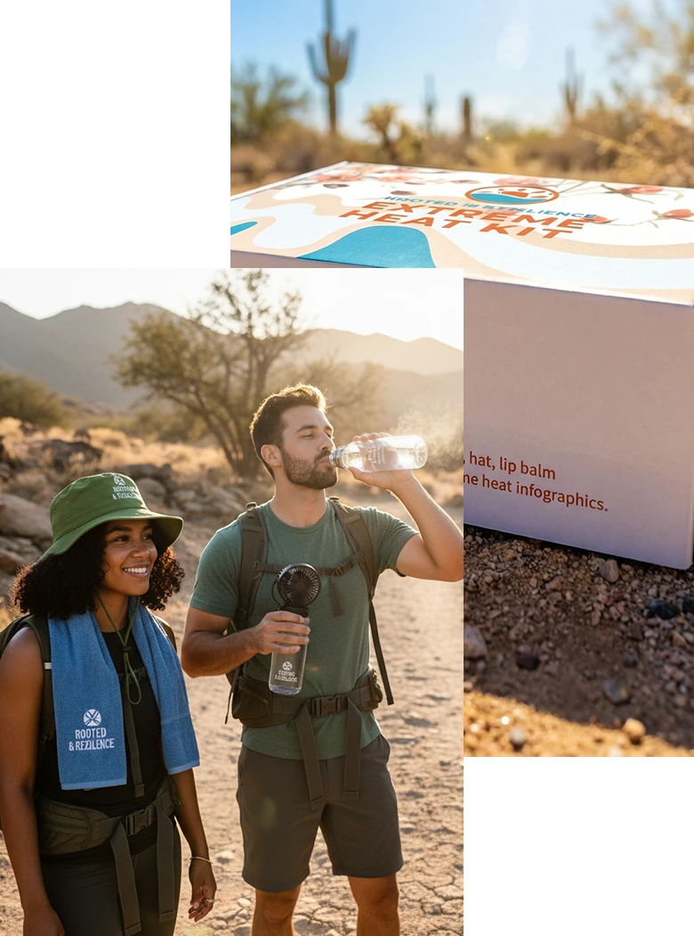 A practical and comforting resilience kit designed to protect your body from extreme heat while offering guidance you can rely on during power outages, outdoor activities, or heat emergencies.